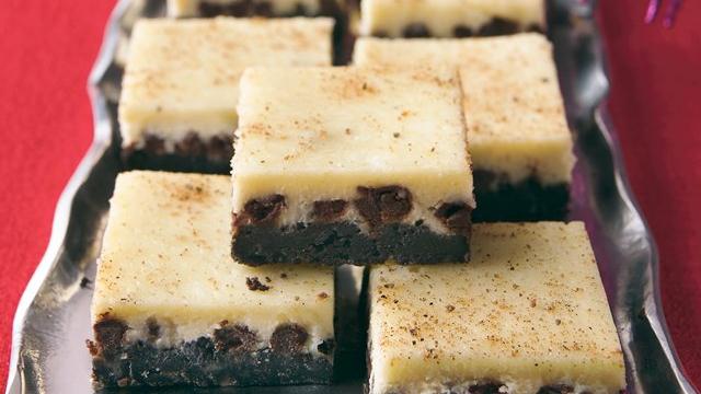 Chocolate-Eggnog Cheesecake SquaresThe holidays may be so far away, but it is never too early or too late to savor this take on the traditional Christmas beverage.  Did we also say that it only takes 20 minutes to prepare this?  (Yields 48 pieces.)